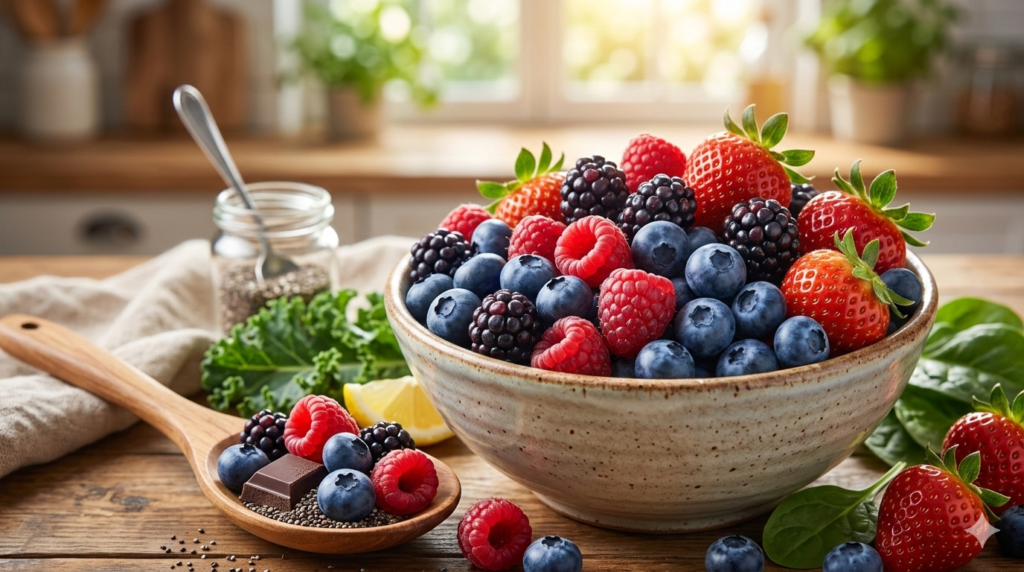 Blueberries, strawberries, and raspberries are high in vitamin C and antioxidants. They reduce inflammation and enhance immune response. Include berries in smoothies, breakfast bowls, or as snacks. Studies link regular berry consumption with reduced oxidative stress and improved immunity. Fun tip: Freeze berries for smoothies or a quick snack.