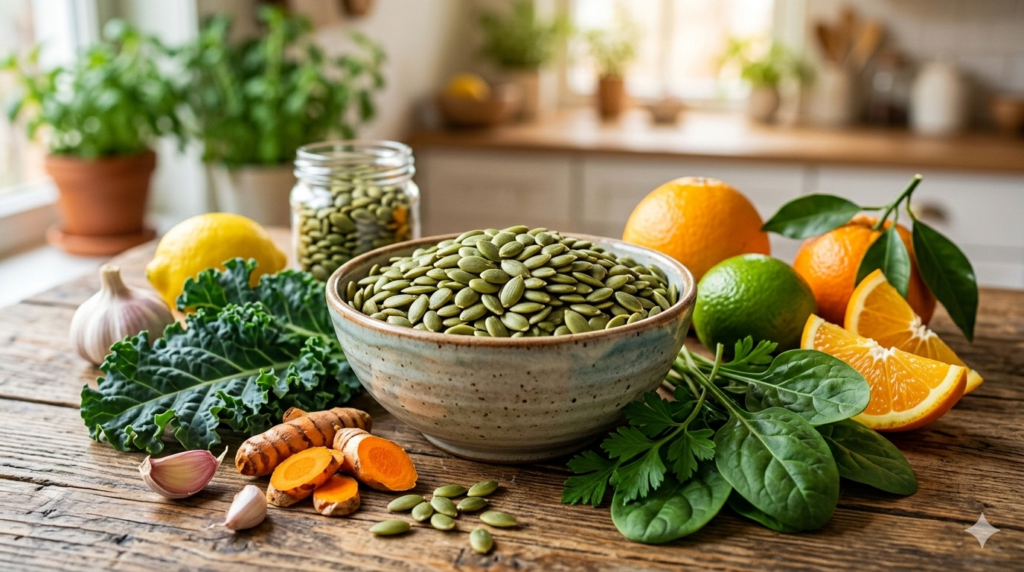 Pumpkin seeds are rich in zinc, magnesium, and antioxidants. They support immune cell production and reduce inflammation. Snack on roasted seeds or add to salads. Research shows zinc intake is essential for optimal immune function. Fun tip: Mix pumpkin seeds with nuts and dried fruits for a healthy trail mix.