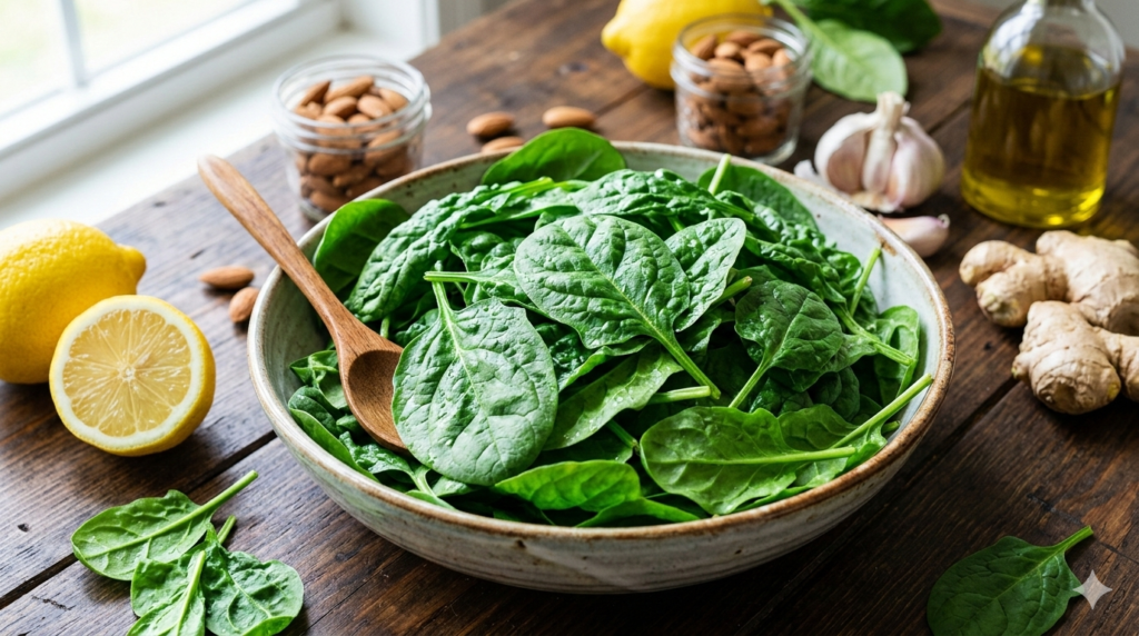 Spinach contains vitamins A, C, and K, as well as antioxidants and iron. These nutrients support immune function, eye health, and reduce inflammation. Eat spinach raw in salads or lightly steamed to preserve nutrients. Research shows leafy greens improve immune markers and reduce oxidative stress. Fun tip: Add spinach to smoothies or soups for an easy nutrient boost.
