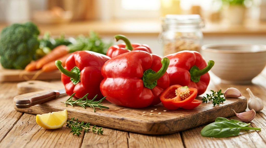 Red bell peppers are rich in vitamin C and beta-carotene. They support skin, eye health, and immunity. Raw, roasted, or stir-fried peppers retain nutrients. Research suggests vitamin C enhances white blood cell activity. Fun tip: Add red bell peppers to omelets or salads for color and nutrition.