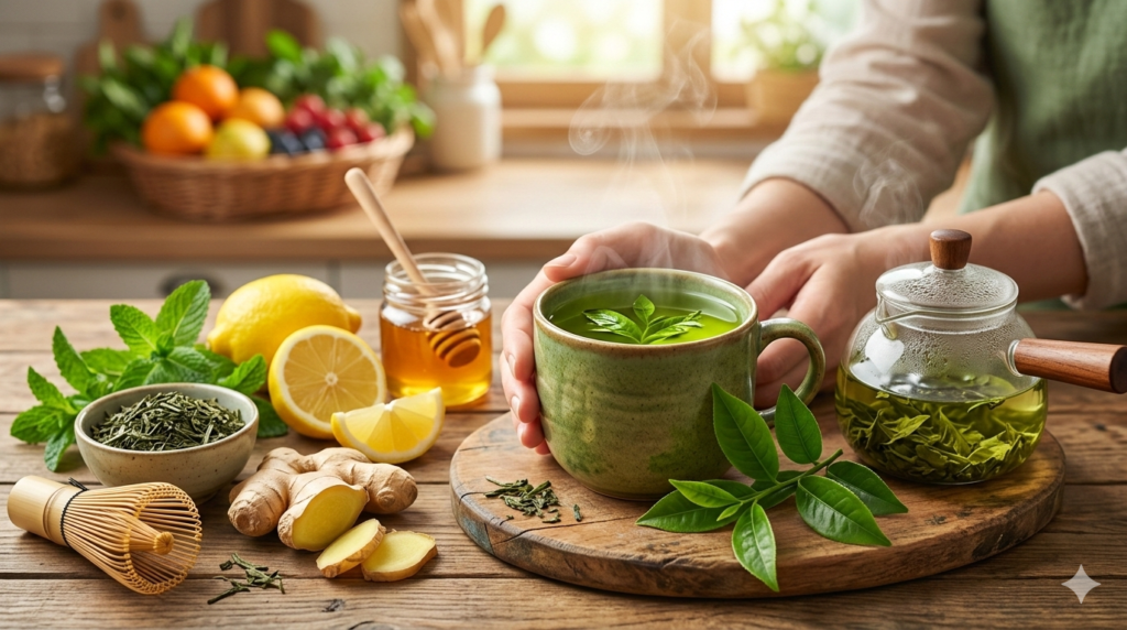 Green tea contains EGCG, a powerful antioxidant that enhances immune response. Drinking 1-2 cups daily supports cellular immunity, reduces oxidative stress, and improves metabolism. Studies show green tea consumption may lower risk of viral infections. Fun tip: Add a slice of lemon or a pinch of ginger to your green tea for extra benefits.