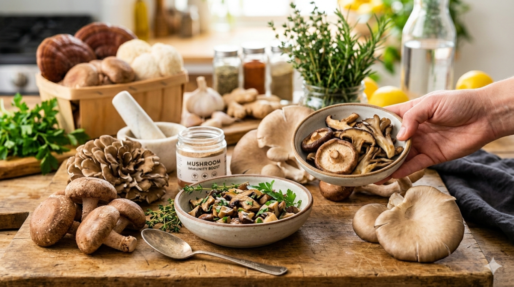Shiitake, maitake, and reishi mushrooms improve immune function. They contain beta-glucans, compounds that stimulate white blood cells. Mushrooms are versatile in soups, stews, and salads. Studies show mushroom intake may reduce inflammation and enhance pathogen defense. Fun tip: Roast mushrooms with olive oil and garlic for maximum flavor and benefits.